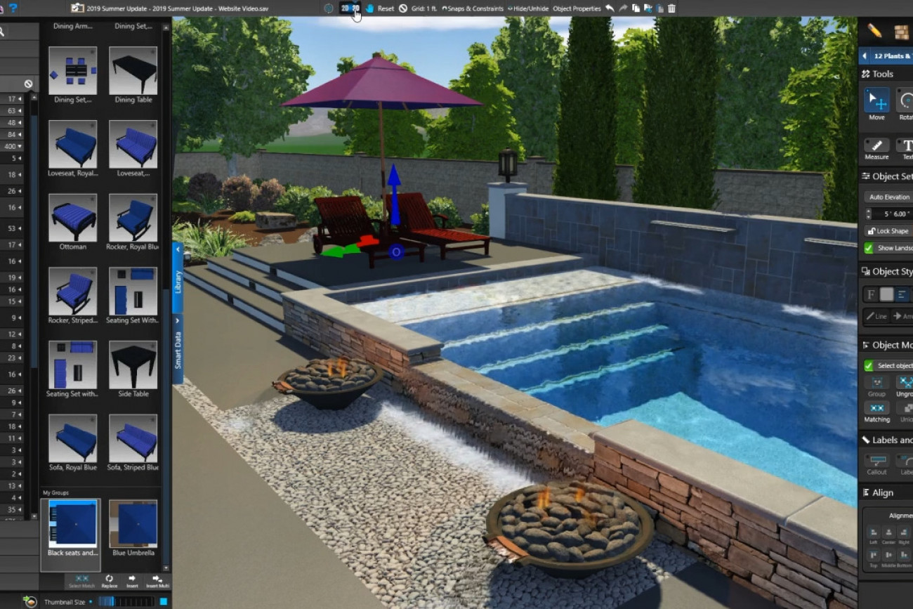 From wood to pavers, tile to walls — the material of each and every surface of your outdoor living design is easy to customize in 3D with intuitive design tools. The landscaping software smart library contains thousands of materials, all sorted into easy-to-find categories that are as easy to search as to browse.